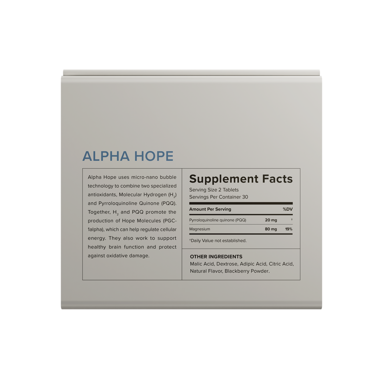 Alpha Hope® uses micro-nano bubble technology to combine two specialized antioxidants, Molecular Hydrogen (H₂) and Pyrroloquinoline Quinone (PQQ). Together, H₂ and PQQ promote the production of Hope Molecules (PGC-1alpha), which can help regulate cellular energy. They also work to support healthy brain function and protect against oxidative damage.